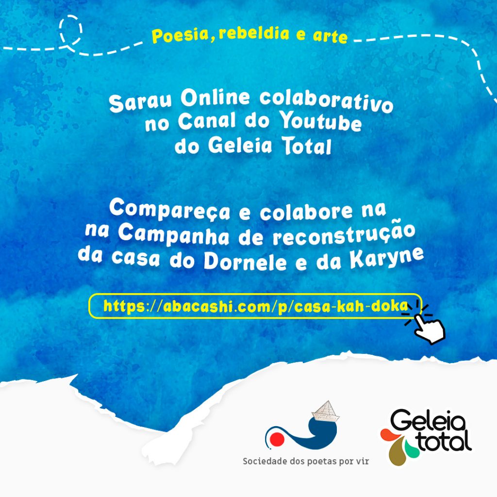 Poemando 14 anos de existência, a Sociedade dos Poetas Por Vir (SPPV) realiza Sarau on-line em parceria com a Geleia Total. Será no dia 18 de setembro de 2020, às 19 horas, no canal do YouTube da Geleia Total. Teremos as presenças de Reação do Gueto, Jamile Jah, My Fuá Band, Poesia, Rebeldia e Arte. O Sarau será em solidariedade à reconstrução da casa de Dornele, Karine e Kyana, da Família Reação do Gueto, a qual foi interditada pela Defesa Civil.