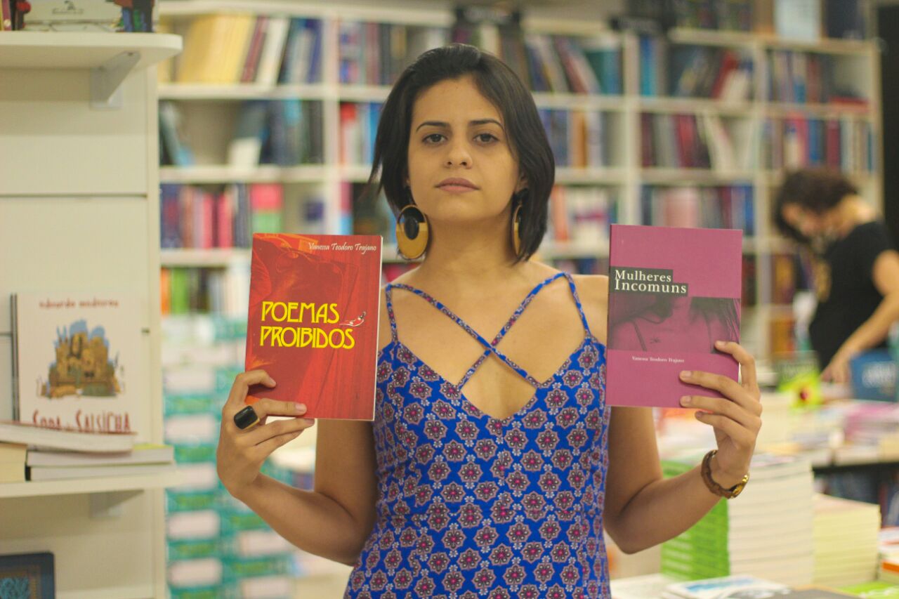 É com esse verso do seu escritor preferido, Machado De Assis, “Quando ela fala”, que apresentamos Vanessa Teodoro Trajano, escritora teresinense, 24 anos, artista plástica e professora de língua portuguesa. Hoje em dia, está fazendo mestrado em Estudos Literários pela Universidade Federal do Piauí. Publicou entre antologias e obras individuais, oito livros, onde destacam-se Mulheres Incomuns (2012), Poemas Proibidos (2014) e Doralice (2015). Começou a escrever logo na infância e teve grande influência na alfabetização pelos seus pais. Segundo Vanessa, já rabiscava poesias e afins aos 14 anos, consolidando a carreira de escritora, ainda no início de sua adolescência. Tropicália e Singular, ela faz um convite instigante a conhecê-la mais a fundo, em seu blog www.conviteparalervanessatrajano.blogspot.com.br. É a menina do canto e encanto da palavra.