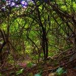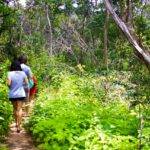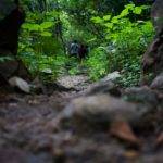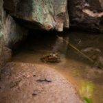 No começo da trilha, o caminho é mais íngreme e cheio de pedrinhas, convém prestar atenção para não deslizar o pé. Se torna um pouco cansativo por isso, pois gasta-se muita energia tentando manter o equilíbrio. A primeira parada se dá na nascente de um riozinho que desconhecemos o nome ou se de fato chega a virar riacho. Lá encontramos um casal de sapos tomando banho e um caranguejeira que, já sem uma das patas, resolveu descansar em cima de uma pedra (ver as fotos). Demoramos pouco coisa ali.