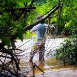 O banho é muito bom. A água é um pouco gelada, mas nada muito desagradável. Nesse dia tava caindo tanta água que tava até chovendo perto da cachoeira. Alguns nativos pescavam de tarrafa, sem que tenhamos visto um peixe sequer. Perto da queda d’água tinha um buraco que provavelmente estava muito fundo. Não me atrevi ir até o final para ver até onde ia, no entanto, dava pra perceber que ele ia descendo. Aproveitamos bastante o local pra que valesse a pena todo o esforço. Depois voltamos.