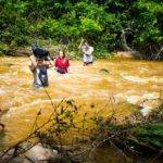 Andamos um bocadinho e chegamos na segunda parada (obrigatória hahah). Foi o riacho. Pense que ele tava forte. Da última vez mal passava do joelho. Dessa vez além de passar da cintura ainda tava bem forte a água. Tem muita pedra escorregadia nessa travessia e por isso estávamos morrendo de medo. Por um instante achei que íamos voltar. Mas ai, eu passei primeiro, com dificuldade mas passei, me sentando nas pedras maiores, e busquei um tronco caído para usar de corrimão pra todo mundo passar mais seguro sem medo de ser levado pela água. Dai o Dom encaixou numa pedra maior que tinha lá e depois todo mundo passou. Foi suado, mas a aventura vale muito a pena, a gente se sente muito bem depois dessa.