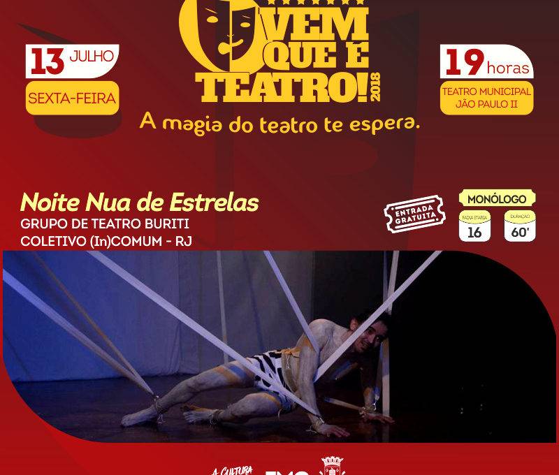 “Noite Nua de Estrelas” narra uma noite na vida de Caíque, um jovem sufocado pelos seus mais profundos sentimentos após de ter sua intimidade exposta nas redes sociais. Preso a uma rede de mentiras, o protagonista, interpretado pelo ator piauiense Dan Martins, vive as dores e consequências dos seus desejos mais secretos. Através do corpo expressionista, Martins entrega-se sem amarras ao processo investigativo para vivenciar seu primeiro solo em comemoração aos 10 anos dedicados ao ofício teatral. A direção é assinada por Diomar Nascimento e o texto é de Vitorino Rodrigues. A montagem do grupo Coletivo (In)Comum propõe um olhar sobre o universo suicida, transitando entre o sentido da vida e os transtornos mentais sociodemográficos. Baseado no Teatro Físico e na Biomecânica de Meyerhold e galgado nas manifestações culturais afro-brasileiras-ameríndias, o solo provoca discussões sobre temas universais como amor, sexualidade e intolerância.