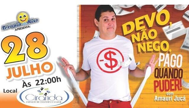 O show de humor “DEVO NÃO NEGO, PAGO QUANDO PUDER” de Amauri Jucá, estará em Picos, dentro do Projeto Terapia do Riso, no dia 28 de julho às 22hrs, no CIRANDA-ESPAÇO DE CULTURA E LAZER. Não fique de fora dessa!!