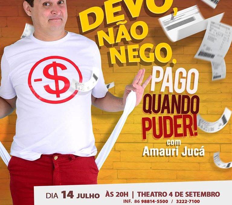 No novo show de humor “DEVO NÃO NEGO, PAGO QUANDO PUDER” Amauri Jucá garante boas risadas com o humor do cotidiano. O show será no Theatro 4 de Setembro, a partir das 20hrs. Não fique de fora dessa!!