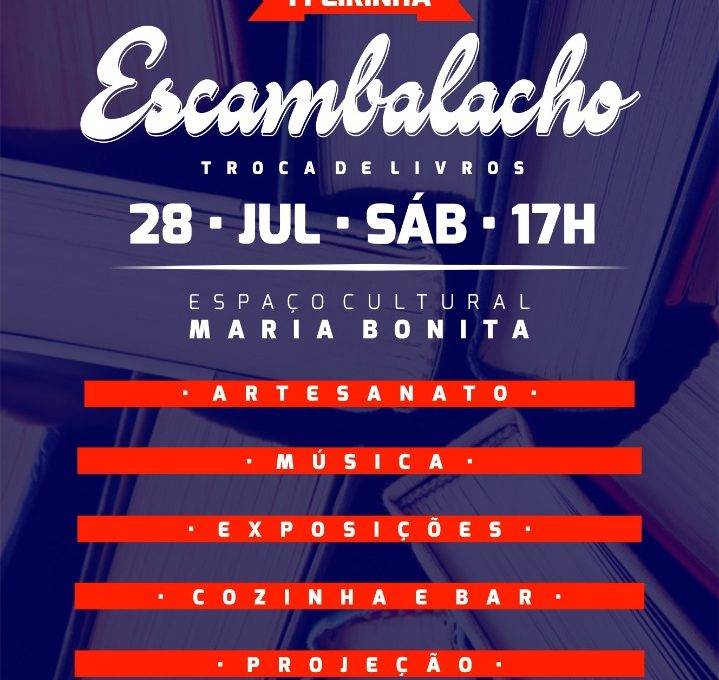 Hoje, 28 de julho acontece, no Espaço Cultural Maria Bonita, a I Feirinha Escambalacho que tem como um dos objetivos promover a troca e doação de livros literários, incentivando a leitura e a convivência em espaços que merecem e devem ser ocupados com práticas culturais. O evento, que é gratuito e para todos os públicos, tem início a partir das 17 horas, contando com apresentações musicais, exposição de artesanato e expressões artísticas, assim como haverá cozinha e bar disponível para os frequentadores da Feirinha.