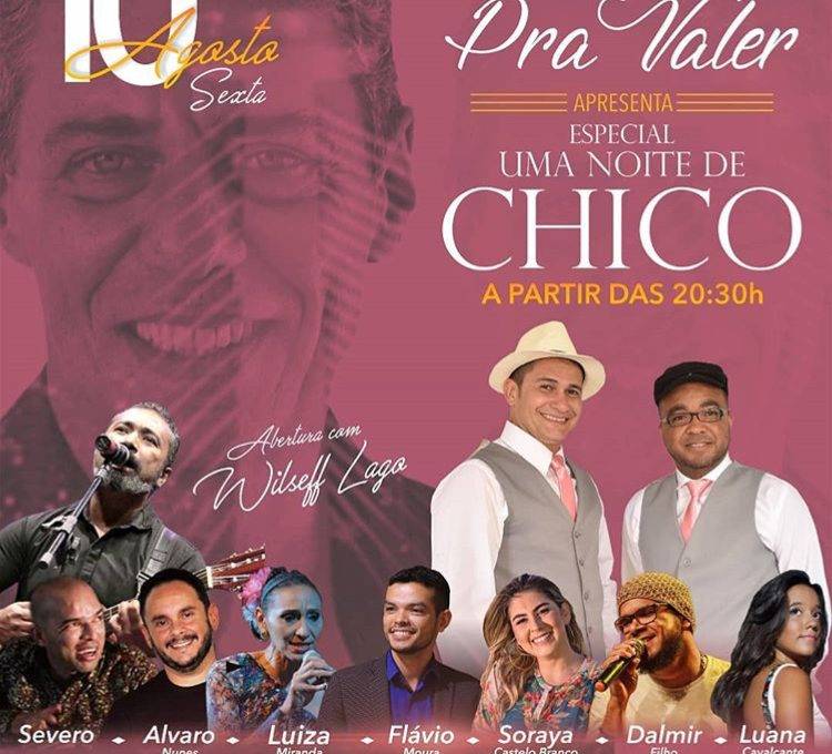 Pagode pra valer apresenta nesta note de sexta (10), a partir das 20h30, um especial Chico Buarque. Com participação de Severo, Avaro Nunes, Luiza Miranda, Flávio Moura, Soraya Castelo Branco, Dalmir Filho, Luana Cavalcante e tendo Wilseff Lago fazendo o show de abertura.