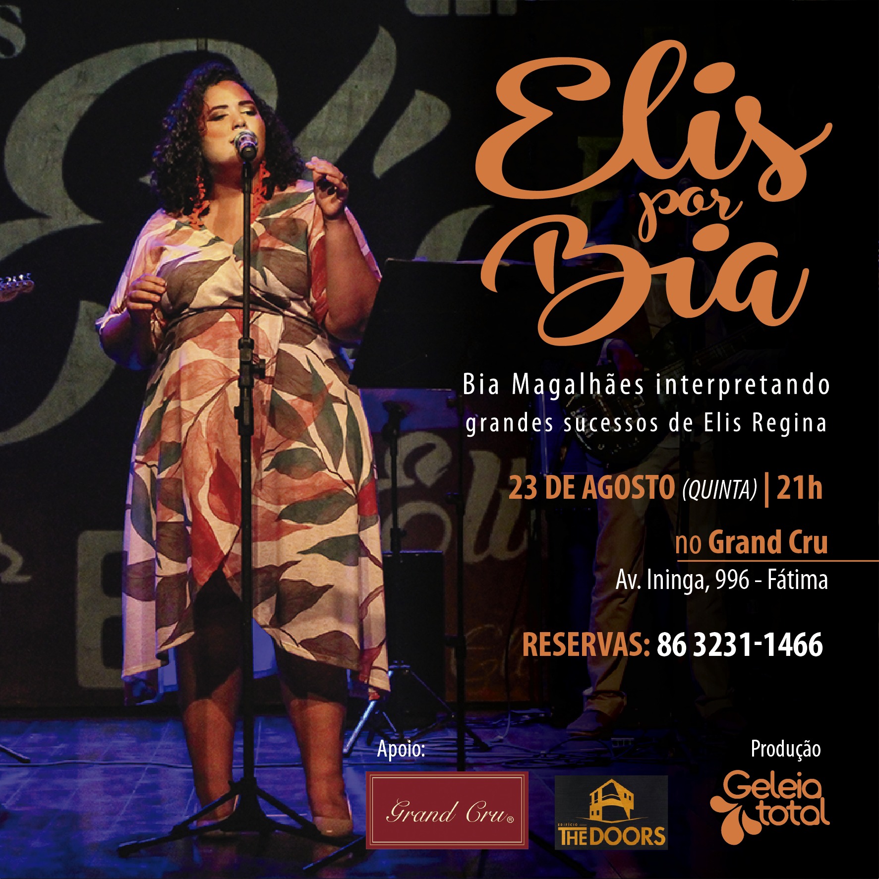 A cantora gaúcha Elis Regina ficou gravada não só na história da música brasileira, como também no nosso imaginário, atravessou gerações com a sua voz e interpretação única, forte e que cativou o público. Elis Regina é pura emoção, seu timbre, carregado de grandes emoções, se tornavam mais fortes nas interpretações, nos gestos e trejeitos da cantora. Venha celebrar conosco uma das maiores cantoras da história do Brasil, que gravou e ajudou a revelar grandes compositores, entre eles o nosso Torquato Neto, com Bia Magalhães interpretando grandes e inesquecíveis sucessos. As três músicas do Torquato Neto gravadas por Elis estão no repertório.