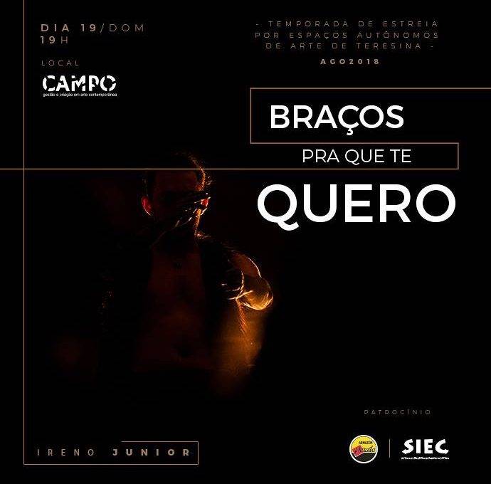 O espetáculo “BRAÇOS PRA QUE TE QUERO” é um estar atento às forças que operam no corpo dançante. Uma dança que pensa na possibilidade de convocar, de pedir passagem. Convoca os braços da mãe, pede seus braços, um chamado, um pedido, uma convocação, dar os braços, entregar os braços na mão da guia, nas mãos da própria dança ainda a ser dançada. A espreita, o chamado da memória, do invisível, do turbilhão de forças imanentes, geradas no e pelo corpo, nas mãos da própria Dança. Voltar o olhar para si, seus movimentos e o que pode ser revelado no mover, dá a ver, como um ganho de realidade do corpo ao dançar, movimentar-se até que se revelem outras maneiras de existir para convocar até deixar de ser dança como manivela que abre, move e expande o estado e o espaço, movimento que não se conforma e refaz continuamente o lugar como pulsão de vida, parte da memória, do afeto, da dança de quando criança como uma pulsão de vida.