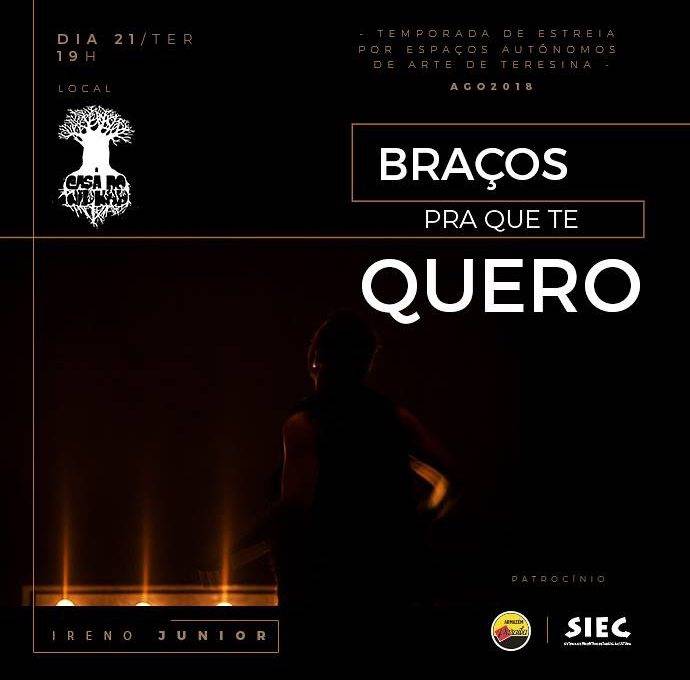 O espetáculo “BRAÇOS PRA QUE TE QUERO” é um estar atento às forças que operam no corpo dançante. Uma dança que pensa na possibilidade de convocar, de pedir passagem. Convoca os braços da mãe, pede seus braços, um chamado, um pedido, uma convocação, dar os braços, entregar os braços na mão da guia, nas mãos da própria dança ainda a ser dançada.