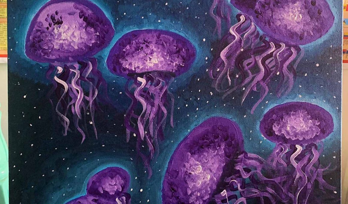 A arte é uma tela com tinta a óleo pintada por Mavi (Mária Vitória). São águas vivas flutuando no espaço.