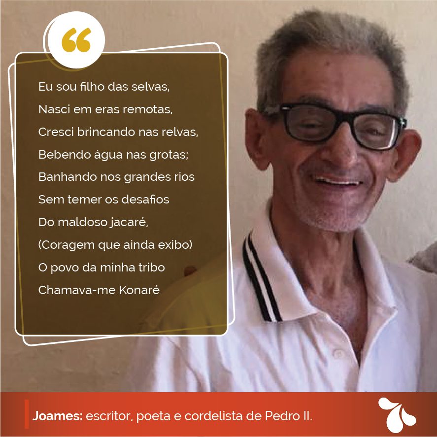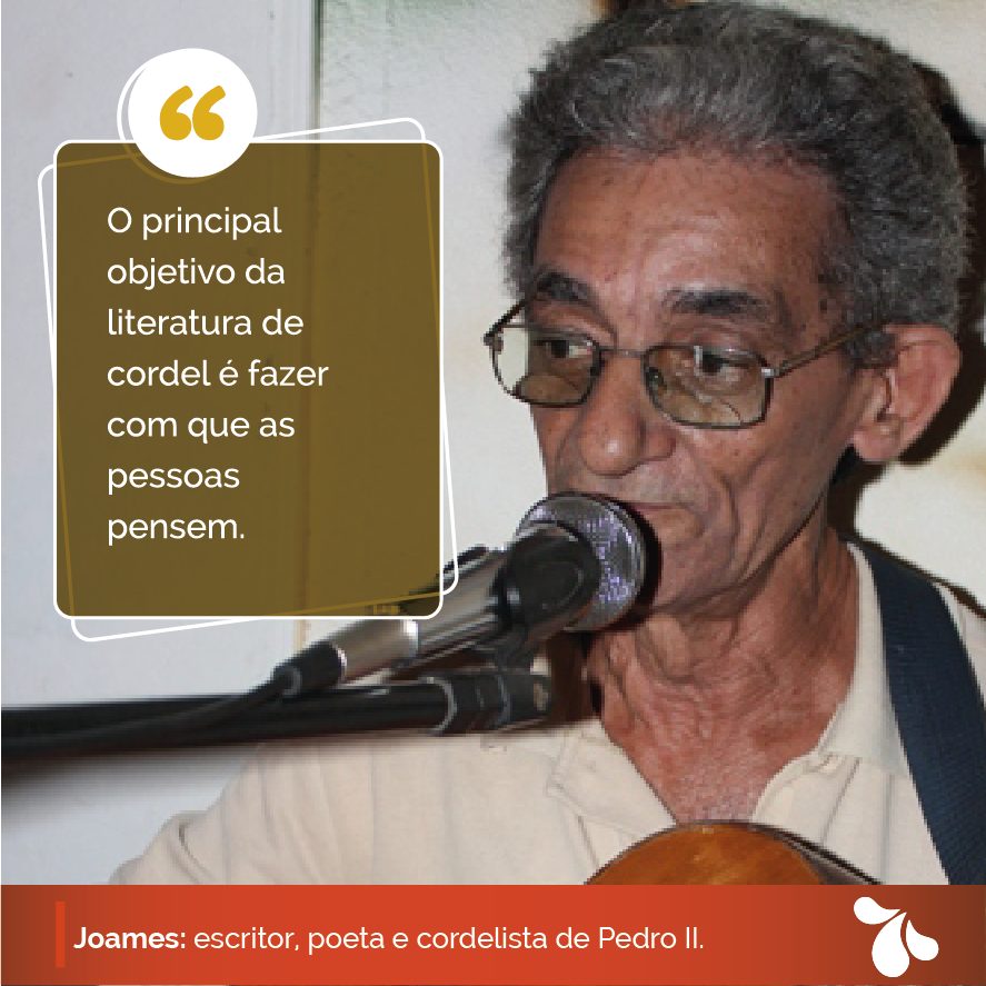 “O principal objetivo da literatura de cordel é fazer com que as pessoas pensem”, pontua Joames, que foi transformando a paixão pelo cordel no seu ofício, o qual desempenha com tanto rigor e devoção. Para o escritor e cordelista, o cordel foi resistindo às transformações e sendo ressignificado nesse trajeto, ocupando um espaço muito importante atualmente, que é o de patrimônio cultural, já que deixou de ser um meio de comunicação para se tornar uma expressão da cultura popular. O artista se tornou uma das referências do cordel piauiense e trabalha no sentido de democratizar cada vez mais a poesia popular, pois acredita que é só por meio da informação e conhecimento que as novas gerações podem conhecer e se apropriar dessas manifestações culturais e artísticas. “A mente, como qualquer membro do corpo, precisa ser exercitada. Se eu não penso na cultura, eu nunca vou desenvolver a cultura”, diz.