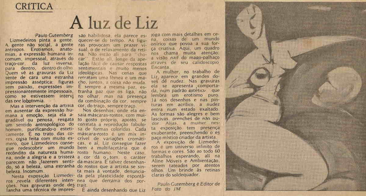 “Liz Medeiros – Individual de Pinturas, Desenhos e gravuras” – Galeria Aline Móveis e Ambientação, Teresina-PI, 23/06/1988;