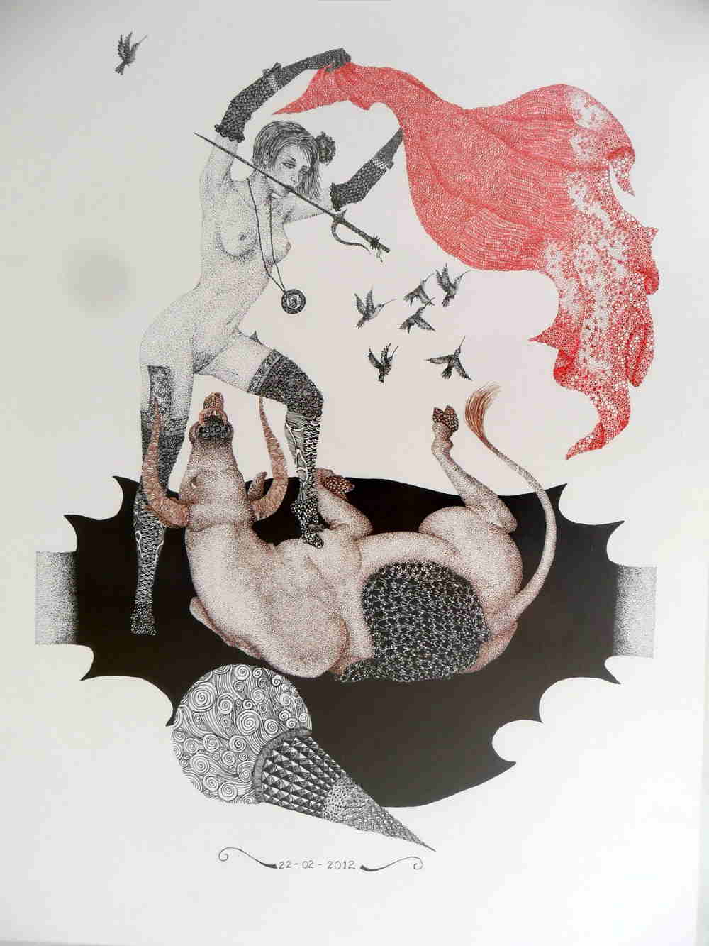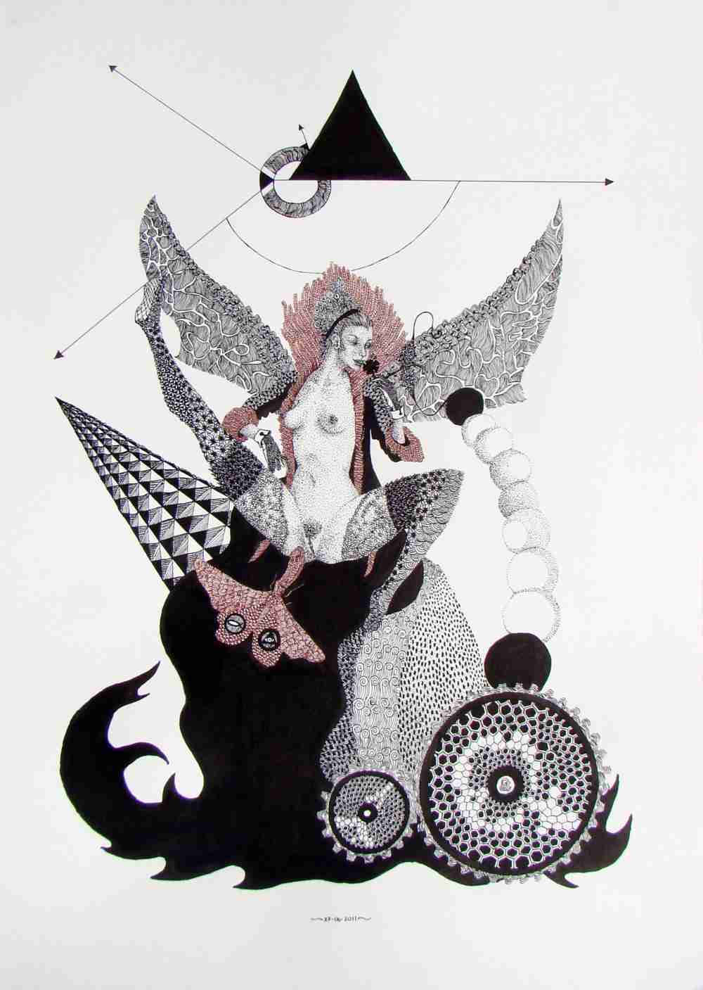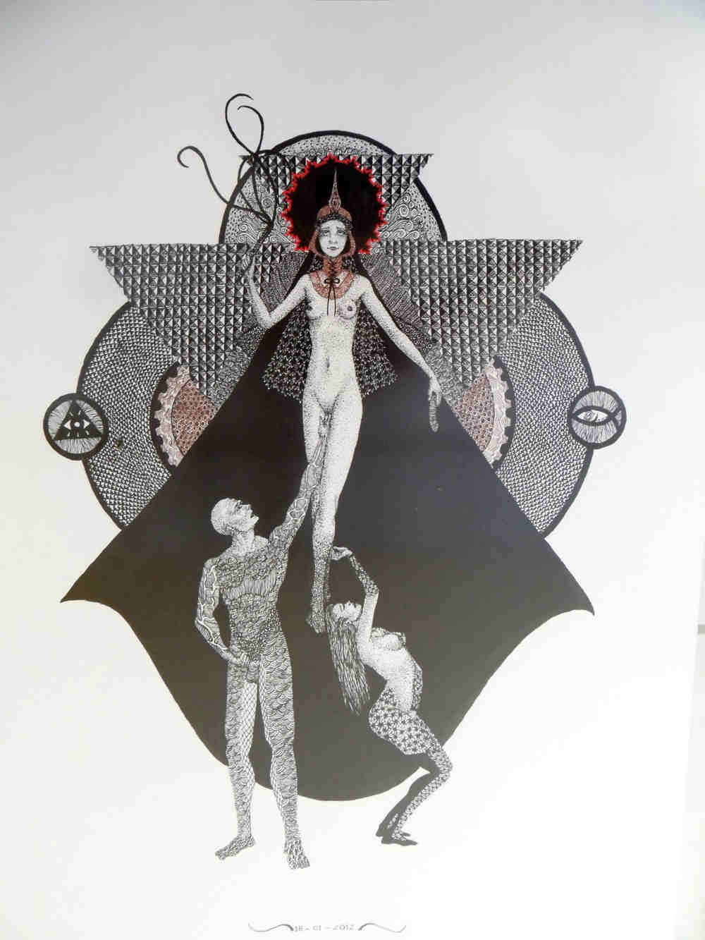 Percebo nas pessoas que observam meus desenhos um choque de reações. A princípio se sentem maravilhadas com o primeiro vislumbre da técnica aplicada (pontilhismo), e a composição áurea com personagens que poderiam fazer parte de uma alegoria divina, mas logo que atentam para os detalhes das genitálias explícitas e de interações que sugerem uma relação sexual que está por vir ou disfarçadamente já acontecendo o espectador recua. Um instinto de defesa natural, eu imagino. Uma vez que não somos educados a falar abertamente de sexo e muito menos ver. Ouso então comentários do tipo “Está lindo, mas não gostei do tema”, “Isso não está meio obsceno?”, “Você poderia ter coberto as partes íntimas”. Como se sexualidade, erotismo e pornografia não fossem assuntos diretamente ligados a nossa condição humana e, portanto necessários de se discutir abertamente em todos os âmbitos da educação. E assim nos deixamos levar por tabus e sensos comuns.