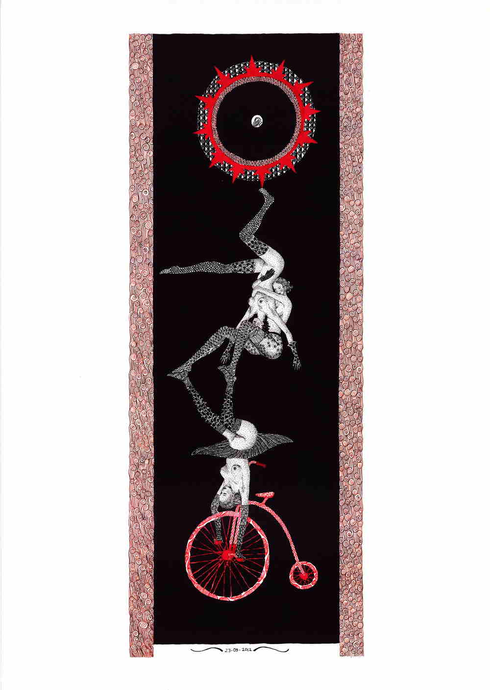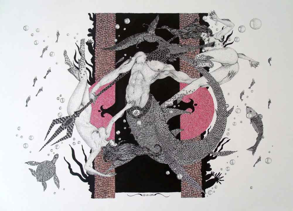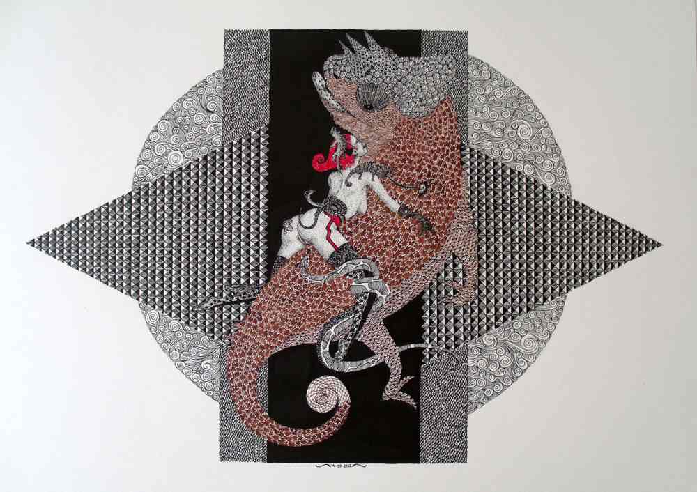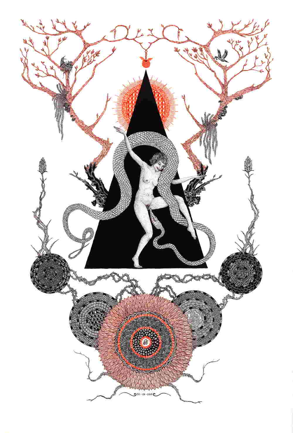 Percebo nas pessoas que observam meus desenhos um choque de reações. A princípio se sentem maravilhadas com o primeiro vislumbre da técnica aplicada (pontilhismo), e a composição áurea com personagens que poderiam fazer parte de uma alegoria divina, mas logo que atentam para os detalhes das genitálias explícitas e de interações que sugerem uma relação sexual que está por vir ou disfarçadamente já acontecendo o espectador recua. Um instinto de defesa natural, eu imagino. Uma vez que não somos educados a falar abertamente de sexo e muito menos ver. Ouso então comentários do tipo “Está lindo, mas não gostei do tema”, “Isso não está meio obsceno?”, “Você poderia ter coberto as partes íntimas”. Como se sexualidade, erotismo e pornografia não fossem assuntos diretamente ligados a nossa condição humana e, portanto necessários de se discutir abertamente em todos os âmbitos da educação. E assim nos deixamos levar por tabus e sensos comuns.