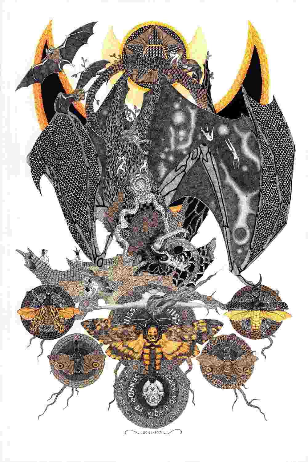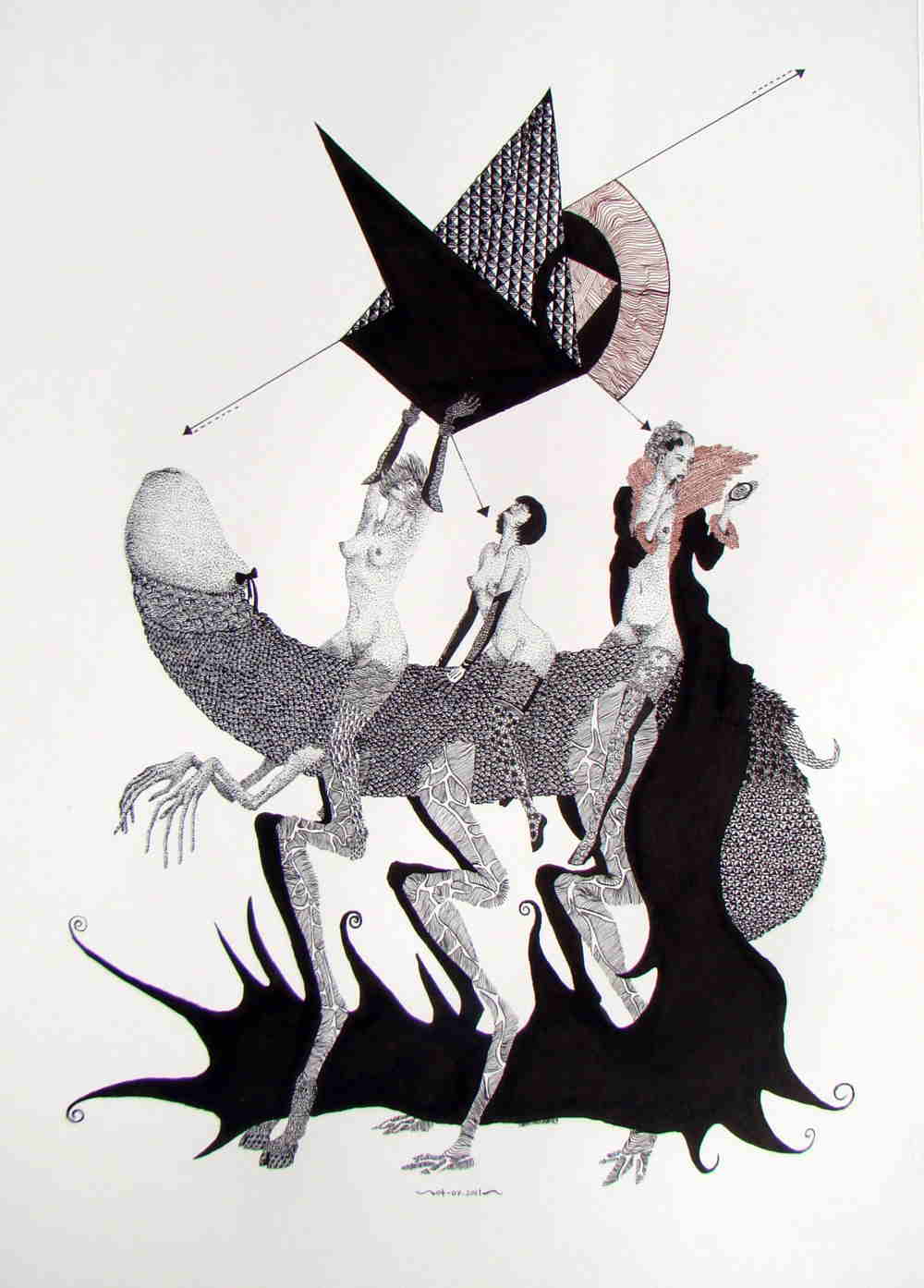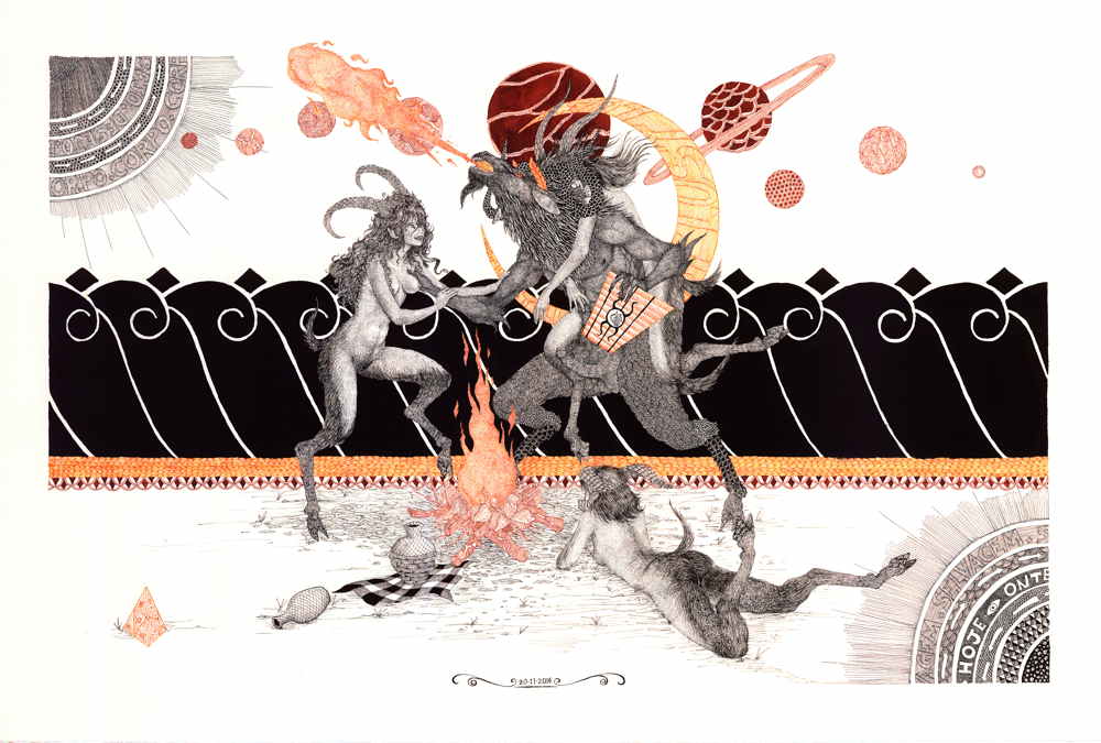 Animais, bestas mitológicas e quimeras habitam os desenhos personificando nossos instintos naturais, o (a) homem/ mulher animal, ser vivo, pulsante. Ao mesmo tempo encarnam o culto ao vigor sexual e as transformações forças no próprio corpo para alcançar estes padrões.” (Texto de José de Arimatéa)