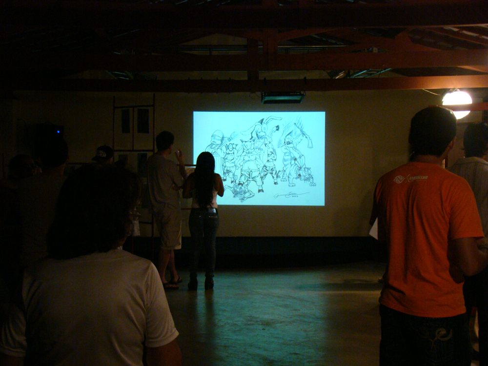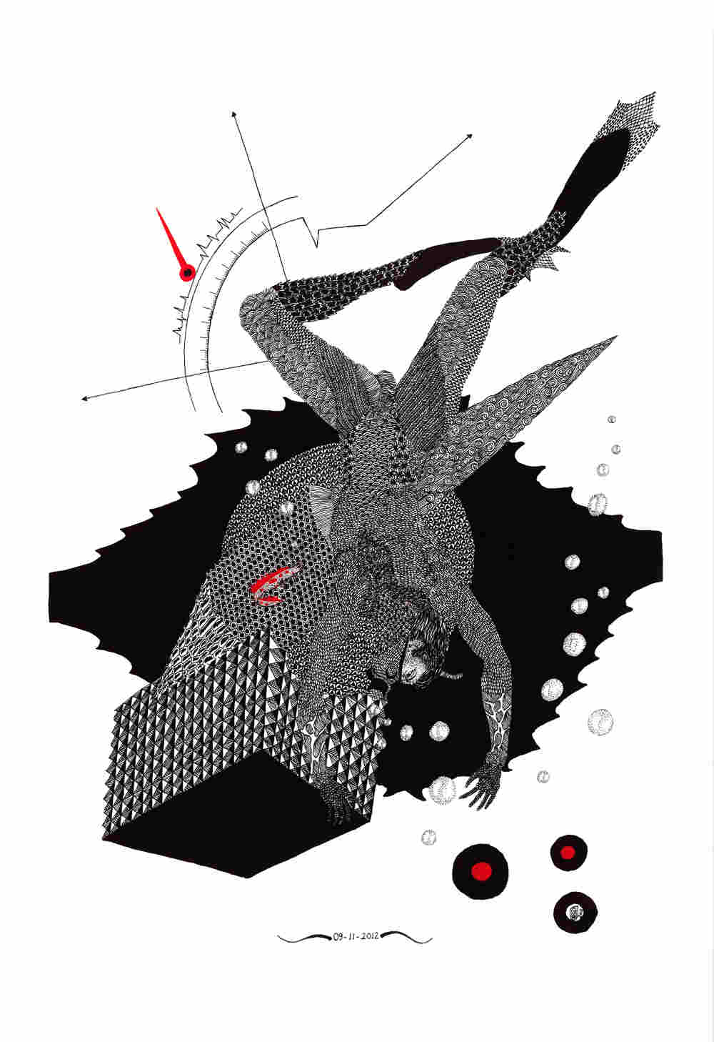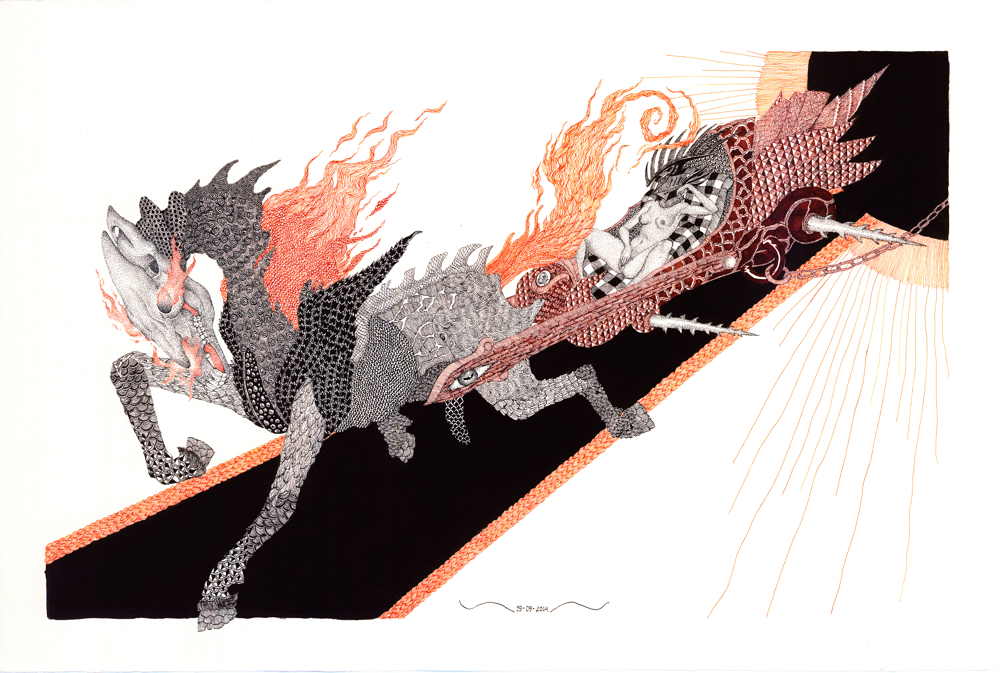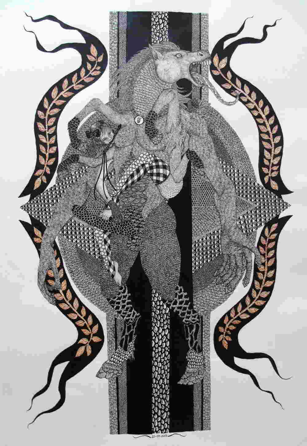 Animais, bestas mitológicas e quimeras habitam os desenhos personificando nossos instintos naturais, o (a) homem/ mulher animal, ser vivo, pulsante. Ao mesmo tempo encarnam o culto ao vigor sexual e as transformações forças no próprio corpo para alcançar estes padrões.” (Texto de José de Arimatéa)