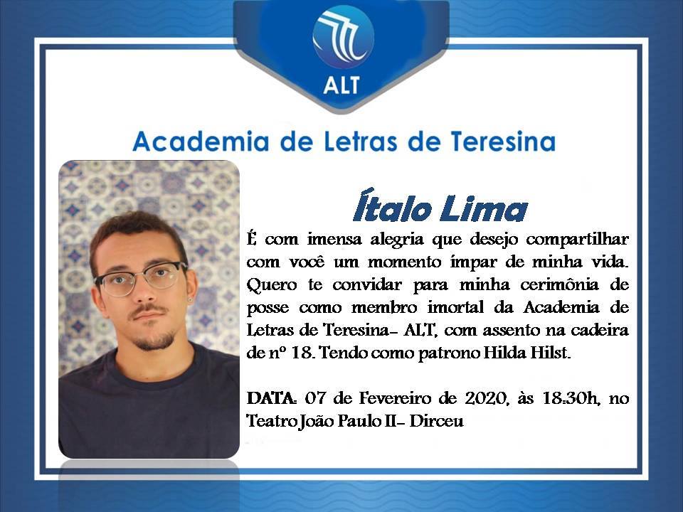 No dia 07 de fevereiro Ítalo Lima assumirá um lugar na Academia de Letras de Teresina na cadeira nº 18 que tem como patrono Hilda Hilst. A cerimônia de posse acontecerá no Teatro João Paulo às 18:30h e será aberta para a comunidade.