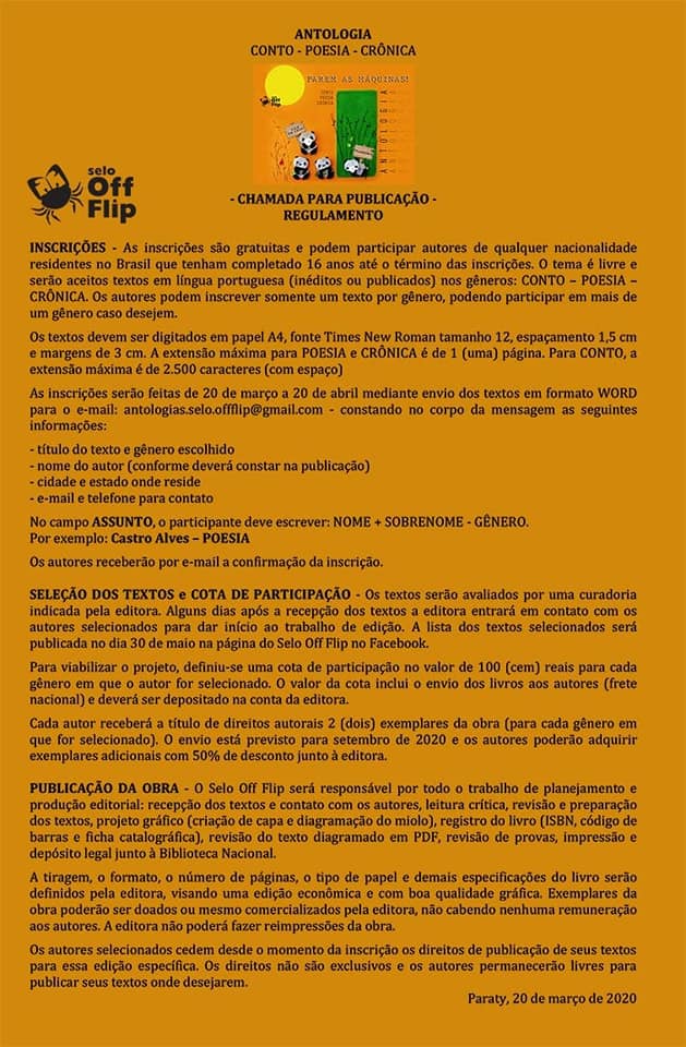 O tema é livre, as inscrições são gratuitas e poderão ser feitas via e-mail (antologias.selo.offflip@gmail.com).