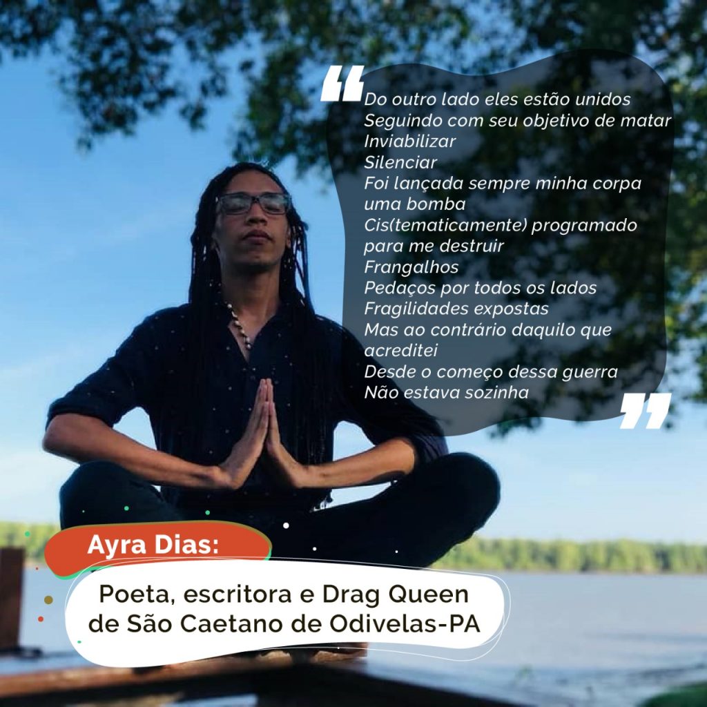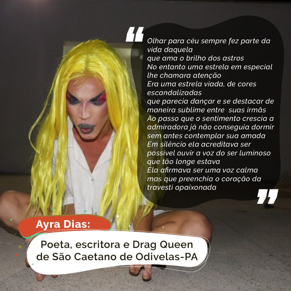 A poeta, escritora e Drag Queen Ayra Dias é natural de São Caetano de Odivelas-PA, mas radicada em Teresina há alguns anos e vive nessa paixão dividida por culturas singulares e muito marcante na sua vida e carreira artística. Ela é graduanda de Serviço Social na Faculdade de Tecnologia e Educação Superior Profissional. Escreve no blog no site Medium. Além disso, Ayra já apresentou no evento “Atrans por elas” que foi organizado pela associação de homens trans do Piauí, onde também performou com declamações poéticas, participou do evento Frenéticas performando como Drag Queen e já palestrou sobre intolerância a comunidade LGBT para uma turma de marketing do Centro Universitário do Piauí – UNIFAPI. Ayra Dias também faz parte do movimento Ballroom e dentro do movimento ela também participa da expressão artística Vogue.