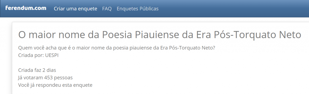 Na segunda-feira, 18/05/2020, fomos surpreendidos com a divulgação de uma Enquete para escolhermos quem seria “o maior nome da poesia piauiense pós-Torquato Neto” promovida pelo site Ferendum com suposta autoria da UESPI (segundo a postagem), apresentando 18 nomes de escritores, dentre estes apenas duas mulheres; mais de quatrocentas pessoas já deixaram marcada a sua preferência.
