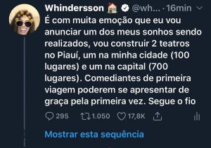 O youtuber e comediante Whindersson Nunes, de 25 anos, veio a público em suas redes sociais na noite da sexta-feira do dia 5 de junho para anunciar que vai construir dois teatros no Piauí, seu estado natal. A atitude, segundo ele, é para levar entretenimento ao público local e revelar novos nomes da comédia.
