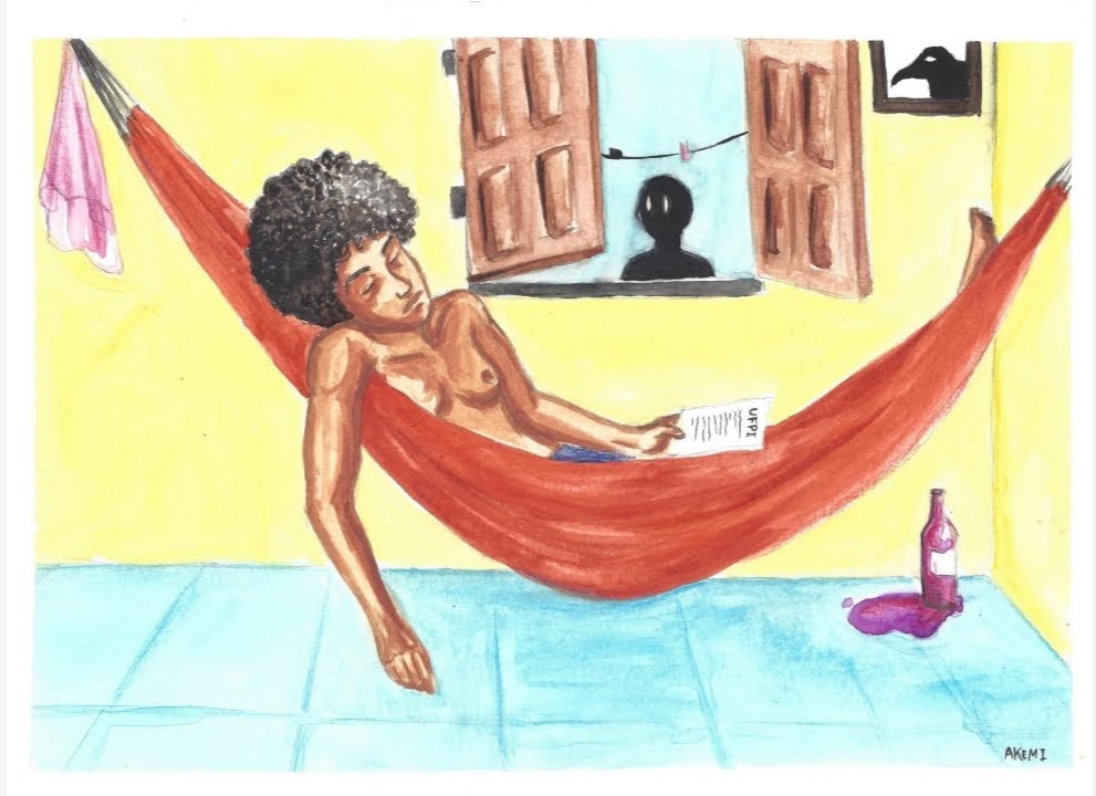 “Na obra “A morte de Akemi” retrato o ápice da minha exaustão enquanto um ser existente no palco de todo o meu cansaço, solidão e tristeza, meu quarto. O gatilho para esta produção se deu quando percebi que minha vida acadêmica estava matando a arte em mim e desesperadamente anulei essa morte representando-a numa pintura. A figura “meu eu morto” aparece novamente, dessa vez, na janela observando o que acontece no quarto. A garrafa de vinho a derramar no chão representa o escape que encontrei para adormecer o sofrimento da minha mente, mas esse anestésico nunca tem efeito permanente, então, a figura que me representa aparece plena, deitada na rede, depois de tanta exaustão aquela figura encontra paz.” (RELEASE “A morte de Akemi”, 2018. Akemi Morais.)