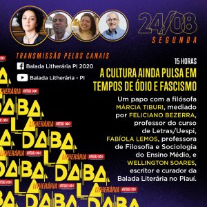 Um papo com a filósofa MÁRCIA TIBURI, mediado por FELICIANO BEZERRA, professor do curso de Letras/Uespi, FABÍOLA LEMOS, professora de Filosofia e Sociologia do Ensino Médio, e WELLINGTON SOARES, escritor e curador da Balada Literária no Piauí