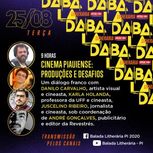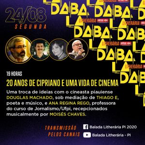 Uma troca de ideias com o cineasta piauiense DOUGLAS MACHADO, sob mediação de THIAGO E, poeta e músico, e ANA REGINA REGO, professora do curso de Jornalismo/Ufpi, recepcionados musicalmente por MOISÉS CHAVES