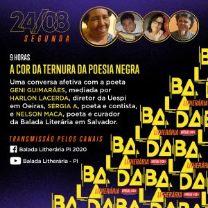 Uma conversa afetiva com a poeta GENI GUIMARÃES, mediada por HARLON LACERDA, diretor da Uespi/Campus Oeiras, SÉRGIA A, poeta e contista, e NELSON MACA, poeta e curador da Balada Literária em Salvador