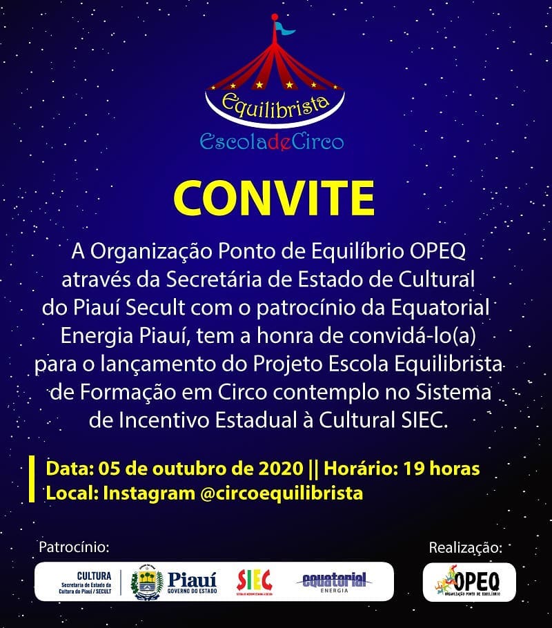 O projeto Escola Equilibrista de Formação em Circo é realizado pela Organização Ponto de Equilíbrio OPEQ através da Secretária de Estado de Cultural do Piauí Secult com o patrocínio da Equatorial Energia Piauí.