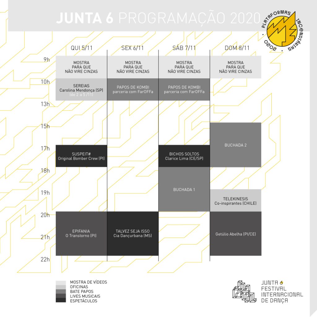 Esta 6ª edição traz a provocação “Plataformas Incendiárias”, onde são colocados temas para se aquecer, requentar, colocar e apagar fogo através da dança dos corpos e das palavras em espaços de debate.