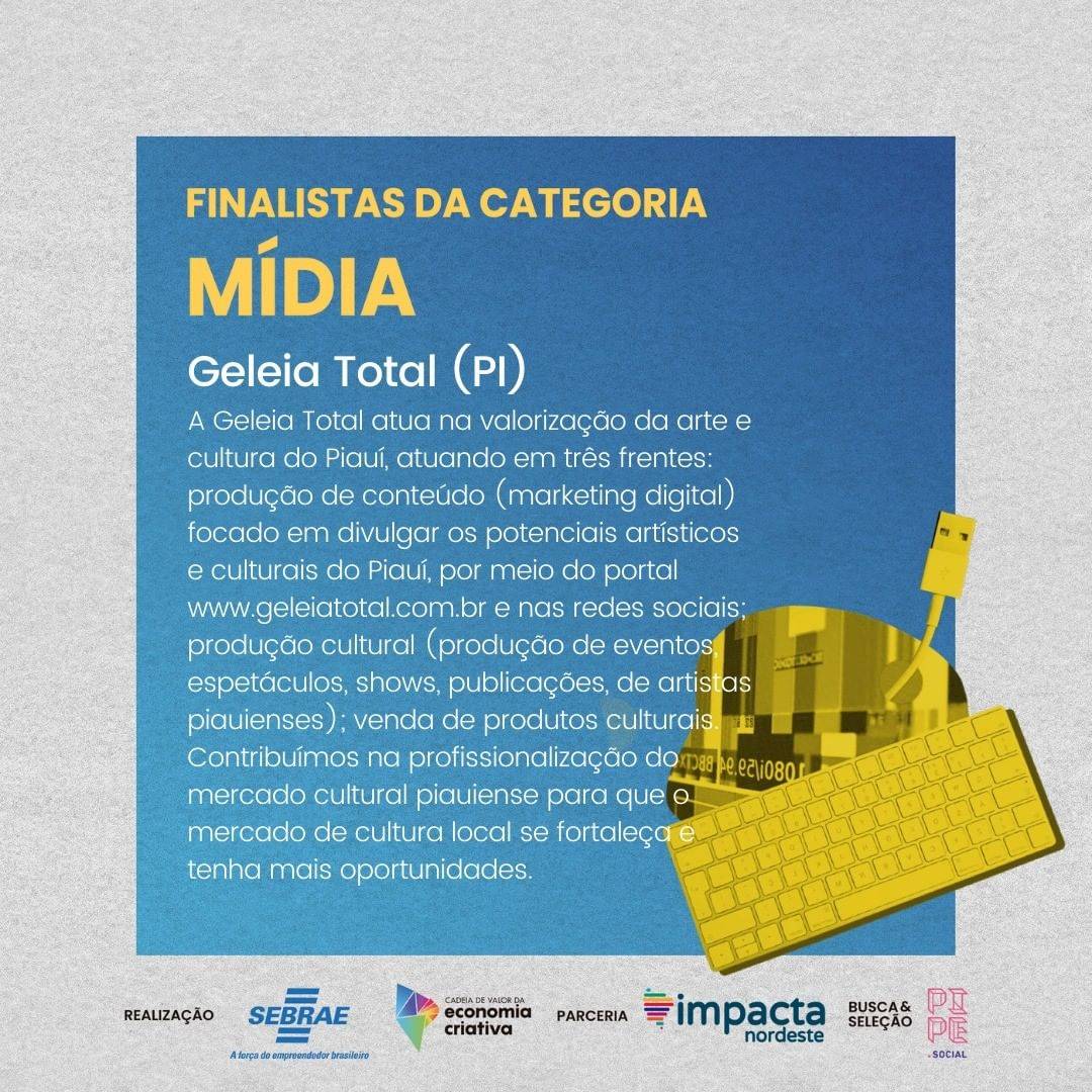 A Geleia Total, na disputa na categoria Mídia, é um projeto que atua, desde 2014, com a missão gerar impacto social valorizando e fomentando a cultura piauiense, dando destaque para a arte produzida no Piauí em toda sua diversidade: tipos de arte, estilos artísticos, gênero, faixa etária, origens, influências, e valorizando o poder dos bons exemplos e de quem, com todas as dificuldades, faz arte e história. Atua produzindo conteúdo sobre a produção cultural do Piauí, produzindo shows, eventos, oficinas, bate-papos e comercializando produtos culturais do Piauí. É um projeto que acredita no potencial da cultura do Piauí e no seu poder de transformação social.