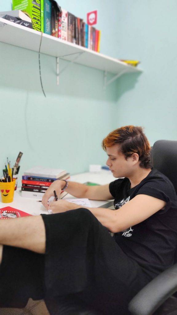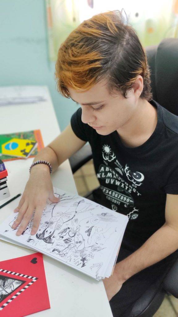 Zayze Medeiros é natural de Teresina-PI, graduande em Psicologia, artista e bicha afeminada, encontrou a arte durante a mais tenra infância e fez desse espaço a sua forma de se expressar, se posicionar e existir no mundo. Atua como cartunista desde 2018 gerindo a página do instagram @quadrinildes, é colunista no site da Geleia Total e produziu a série de tirinhas “Caixa de Pandora” para o programa Estúdio Interativo da TV Assembleia de Teresina. Além disso, Zayze já participou da exposição “Vivências” no Festival Rumbora (2020) e a exposição no Festival de Artes Integradas Piaga (2019. “Por que não falar do cotidiano das pessoas trans? Assim nasceu as personagens trans, inspiradas na cartunista Claire Bretécher.”