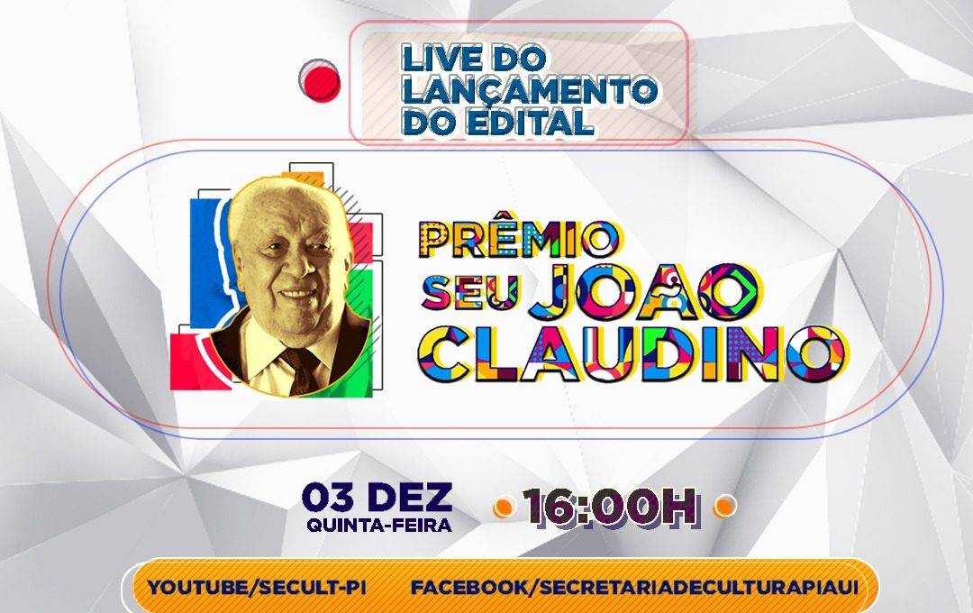A Secult lança o Edital “Prêmio Seu João Claudino” que premiará de artistas, trabalhadores e trabalhadoras da Cultura e iniciativas Culturais, no âmbito do Estado do Piauí. O Edical tem o objetivo de fomentar e estimular a recuperação do setor cultural em todo o território piauiense, considerando a democratização do do acesso, a inclusão social, a diversidade, a acessibilidade e a sustentabilidade nas ações a serem beneficiadas. As inscrições vão até o dia 10/12 e podem ser feita enviando a documentação digitalizada, em formato PDF, de acordo com a categoria escolhida, para o e-mail: inscrição.editaljclab@secult.pi.gov.br.