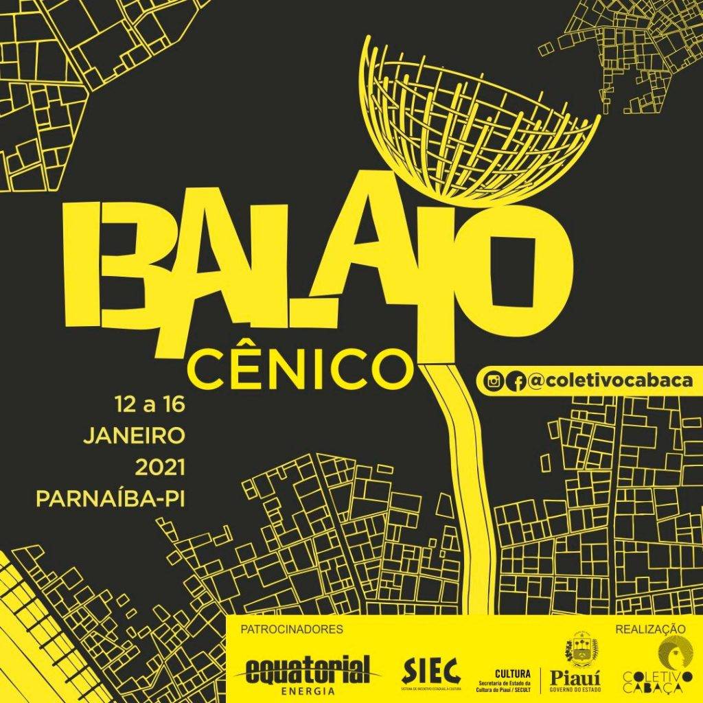 O Coletivo Cabaça promove, nos dias 12 à 16 de janeiro de 2021, o BALAIO CÊNICO – Festival Nacional de Parnaíba. A programação contempla teatro, dança, performance, circo e audiovisual, oficinas, workshop, lançamento de livros e experimentos cênicos. A programação receberá grupos e artistas de Parnaíba (PI), Teresina (PI), Fortaleza (CE), Salvador (BA) e Cuiabá (MT). O Festival ocupará o Teatro Saraiva e, o encantador, Castelo de Thor. Tudo organizado sobre o olhar da segurança a saúde pública dos participantes.