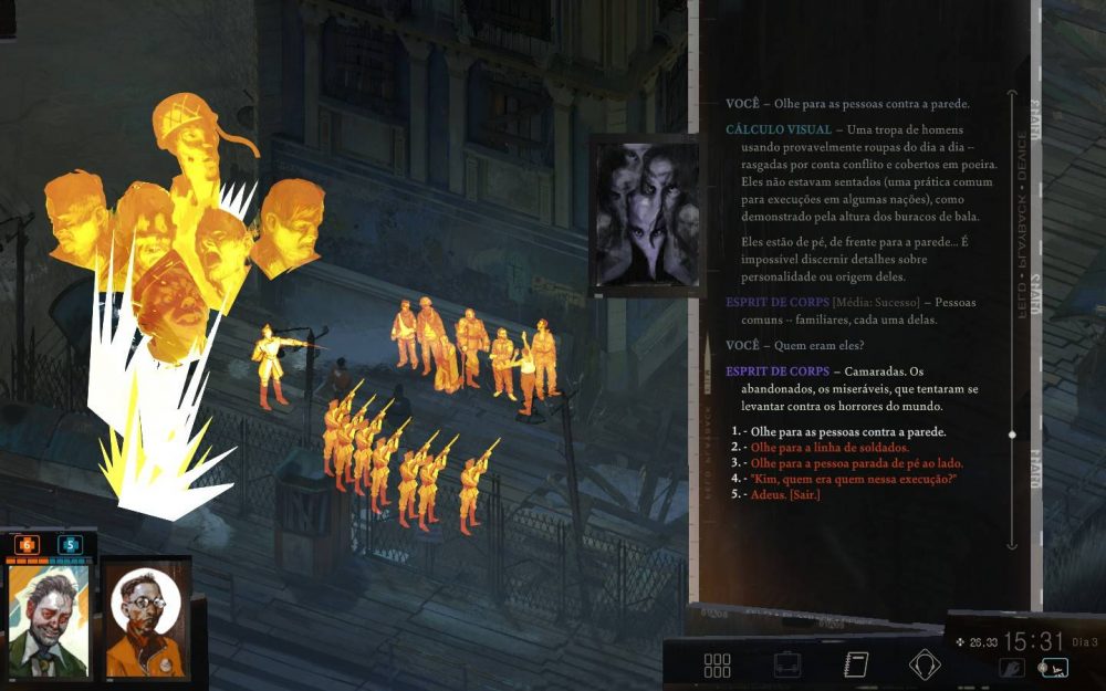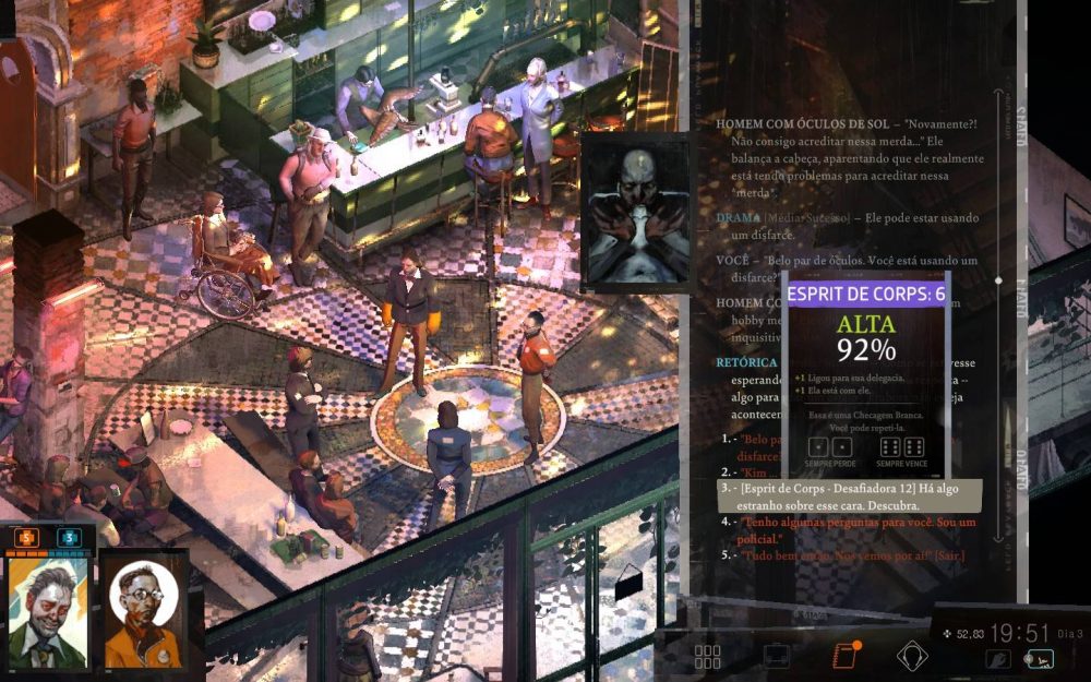 O diálogo do game, que é o seu grande pilar de sustentação, é gostoso em boa parte por causa da sua interação com as escolhas de habilidades do seu personagem. Se durante um interrogatório policial o jogador tiver muito atributo de Drama e Empatia, o game te dá opções de dialogo onde os atributos, simulando vozes da sua consciência, conversam com o jogador para dizer: “Ei, talvez ele esteja mentindo!”. Somado a isso existe também um sistema de rolamento de dados, que deixa o jogo com ainda mais possibilidades.