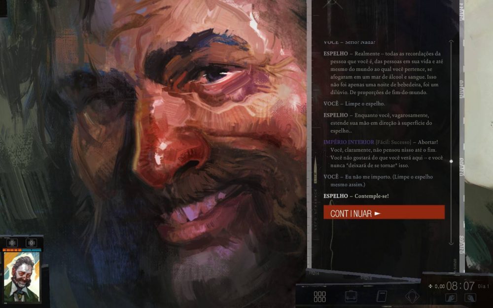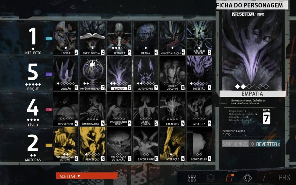À medida que as missões do jogo são feitas, você é recompensado com Pontos de Habilidade e, ao atingir os 100 pontos, fica disponível para escolha algum atributo da Ficha de Personagem. Pode escolher o atributo Drama, e saber quando as pessoas estão mentindo pra você, ou escolher Empatia e ter opções de diálogo que te façam entender os problemas de outros personagens, pode escolher Calafrios e, às vezes, sentir algo no seu corpo que dê dicas de como resolver algum impasse e até mesmo escolher Coordenação Motora e tomar decisões corporais ágeis em momentos específicos. E, o mais legal de tudo isso é que, todos esses 24 atributos, quando escolhidos, se tornam vozes da sua cabeça, cada um deles com uma personalidade e linhas de diálogo únicas que aparecem nas interações com os demais personagens e objetos do ambiente.