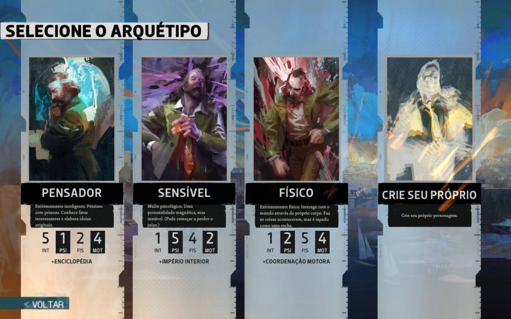Ao iniciarmos o jogo, somos apresentados a uma tela de escolha de arquétipos, onde como em um RPG qualquer, temos os tipos de habilidades e a quantidade de pontos que cada uma pode ter, de acordo com cada arquétipo, por exemplo, o “Pensador” tem muitos pontos de Inteligência, mas poucos de Físico, enquanto o “Sensível” tem muitos pontos em Psicológico e poucos de Inteligência, e, além disso, tem a opção do próprio jogador criar seu arquétipo, onde você redireciona seus pontos para qual atributo quiser. Não surpreende tanto pois, de certa forma, o alicerce de um RPG é ter pontos para distribuir em atributos que constroem seu personagem, mas Disco Elysium vai além disso.