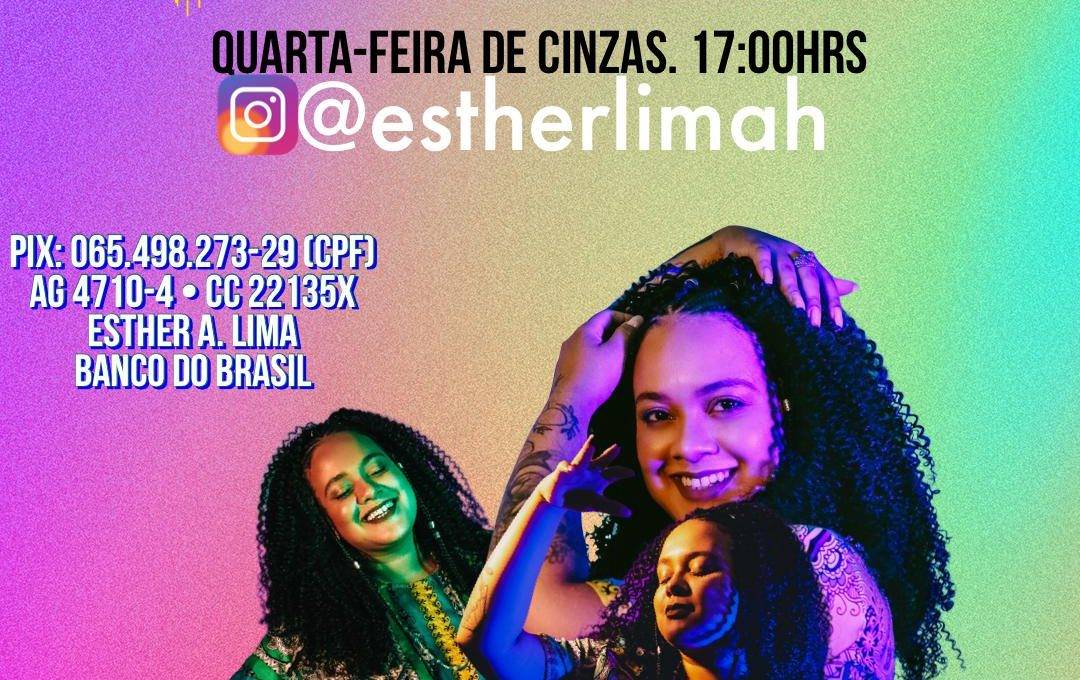 A cantora Esther Lima vai realizar uma live carnavalesca no seu instagram nesta quarta-feira às 17h. Muita marchinha e muito frevo, com a participação de Chico Nascimento.E você pode contribuir com qualquer com o couvert digital, através do PIX Cpf- 065.498.273-29- / Banco do Brasil- Ag- 4710-4 Cc. 22135x – Esther A. Lima.