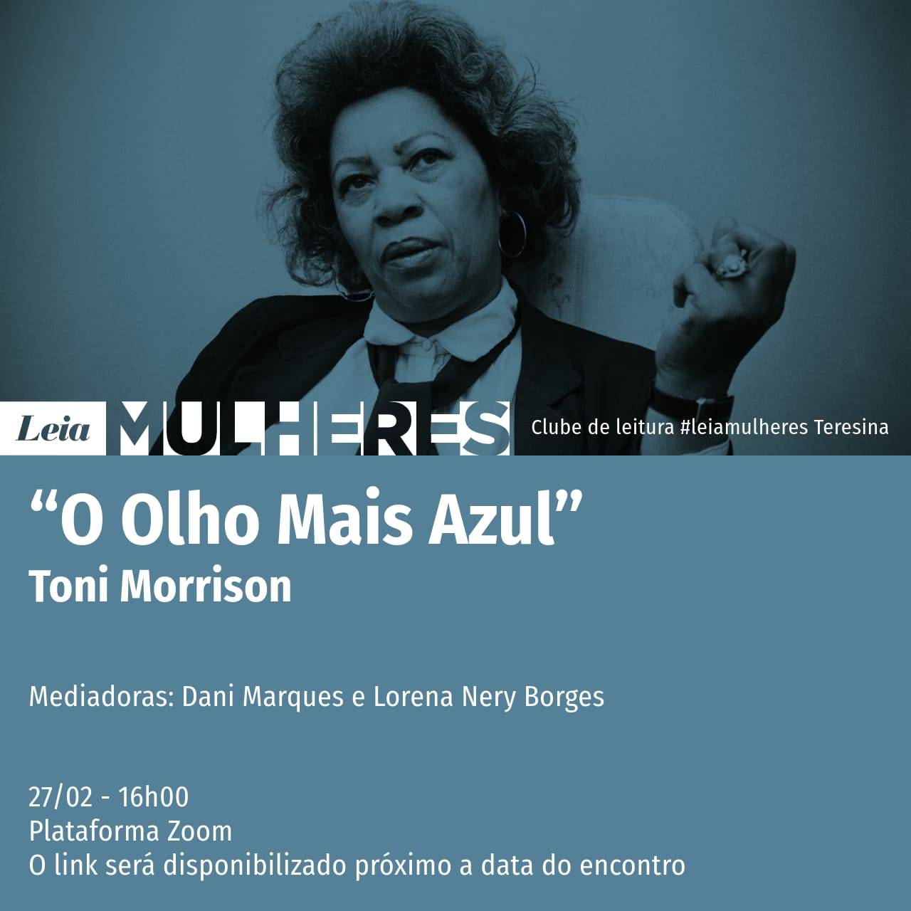 Dia 27 às 16h acontecerá mais um encontro do leia mulheres- Teresina, que será mais uma vez virtual e transmitido pela plataforma zoom. A obra debatida será “o olho azul” da escritora nova-iorquina Toni Morrison. O leia mulheres- Teresina, que é mediado pelas escritoras Lorena Nery e Dani Marques, é grande projeto de âmbito nacional que tem como objetivo incentivar a leitura de obras produzidas por mulheres.