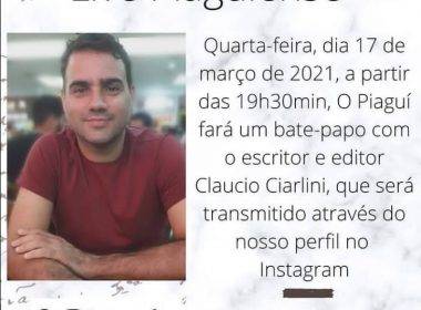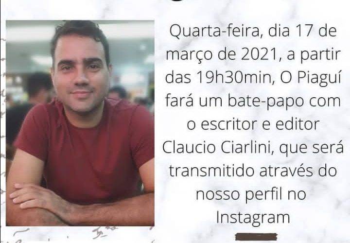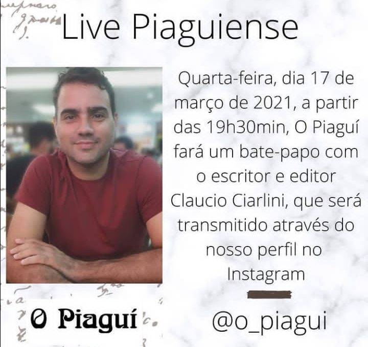 Foi também nesse contexto que surgiu a live piaguiense, uma série lançada em outubro de 2020, com o objetivo de prosseguir com a difusão da cultura piauiense, através de encontros virtuais com os artistas e suas obras, além de claro estimular a leitura. Nesta quarta- feira a série chega no seu décimo nono episódio e terá como convidado o escritor, professor e cineasta Claucio Ciarlini. O bate papo acontecerá a partir de 19h30 e será transmitido no instagram do o piagui.