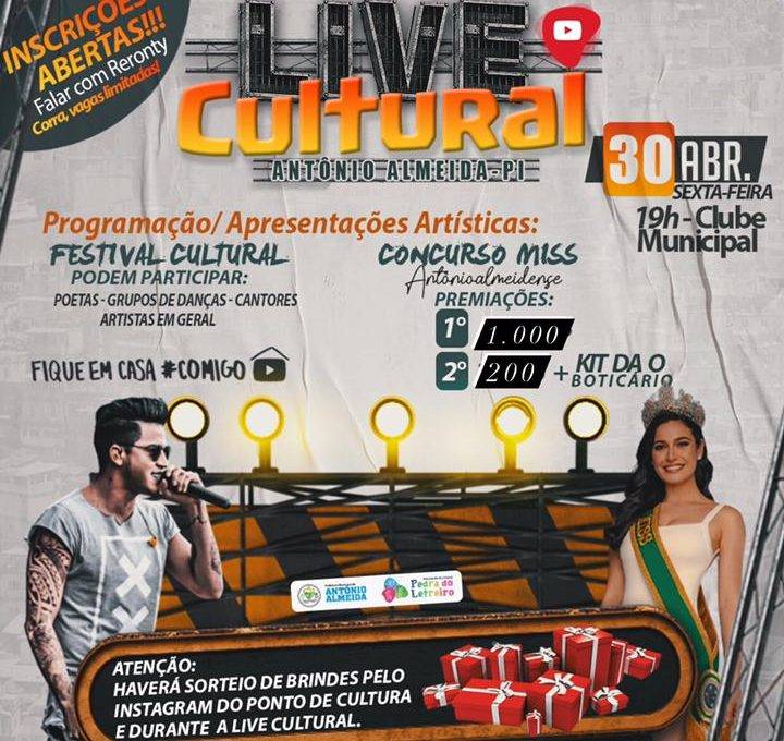 Amanhã às 19h acontecerá a live cultural de Antônio Almeida-PI, diretamente do Clube Municipal, com transmissão no canal do youtube. Com uma vasta programação, que inclui apresentações artísticas e o concurso da miss Antônio Almeida!