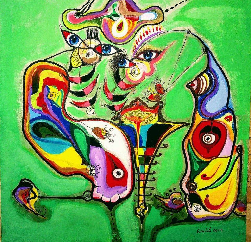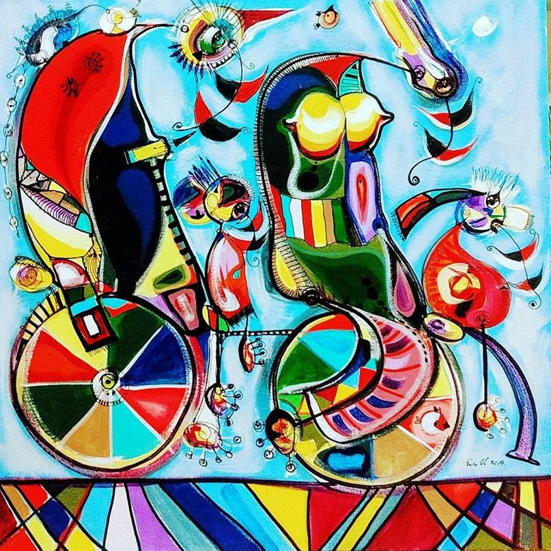 Ainda sobre o surrealismo, podemos citar o espanhol Joan Miró como outra referência bastante presente em produções marcantes. No período de criação mais intensa no que Evaldo coloca como “lado mirótico”, costumava apanhar desenhos de seus filhos ainda pequenos e transformá-los a partir de seus traços. “Quando você olha para meu lado mirótico, para representar a boca, por exemplo, vai encontrar formas de meia lua, divididas em um lado preto e outro vermelho.” Ele ainda exemplifica com alguns títulos, como “O Beijo”, “O Abraço”, “O Namoro”, “Passeio de Bicicleta”, entre outros.