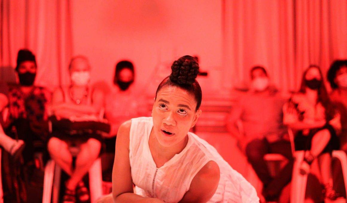 No princípio aquela Luz vermelha já era um convite pra acessar qualquer outro espaço que organize uma realidade diferente, uma realidade mais Exu, mais Encruzilhada. A plateia vai caminhando lentamente em direção àquela sala vermelha, onde de dentro ouve-se alguém cantar, num tom de voz que assenta, quase uma ladainha, onde a voz se prostra diante de alguma coisa maior que o próprio espaço e a própria voz. Foram assim os primeiros minutos do Espetáculo, aqueles sujeitos guardados no espaço, cada um e uma em sua oferenda de movimento, de suor e de voz. Seria um pedir licença para o que viria? Foi assim que compactuei com eles, ouvindo vez em quando de olhos fechados, aquela voz que chamava por Exu, que rogava por presença.
