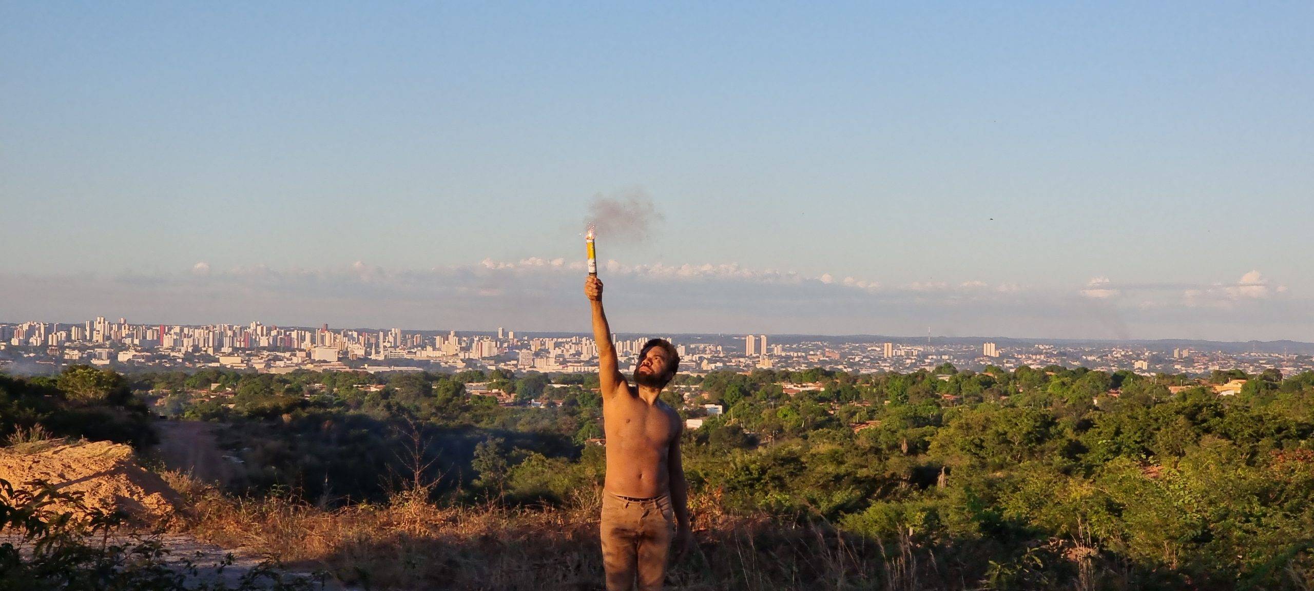 À primeira vista o trabalho foi reconhecer os símbolos que são comuns nas minhas referências, aquele cenário parecia um parquinho, desses que encontramos nas praças ou parques públicos, geralmente em zonas periféricas de algum centro urbano, um escorrega, um gira-gira, tambores de 200 litros, sacolas de pão espalhadas pelo palco, ténis pendurados sobre o palco lembrando essas ruas próximas a escolas, onde os ténis se amontoam nos fios de energia elétrica, pipas e rabiolas também, e no início uma espera e um silêncio. Lugares como esses lembram de infância, de movimento, de brincadeira, era esse o tom no início do acontecimento cênico.