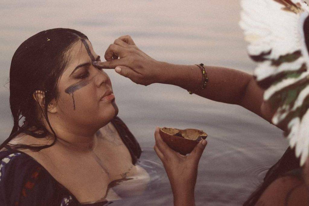 A cena se completa com água caindo por sobre a cabeça de Monise, de uma cuité segurada e sagrada pela Vida Aliã Wamiri.