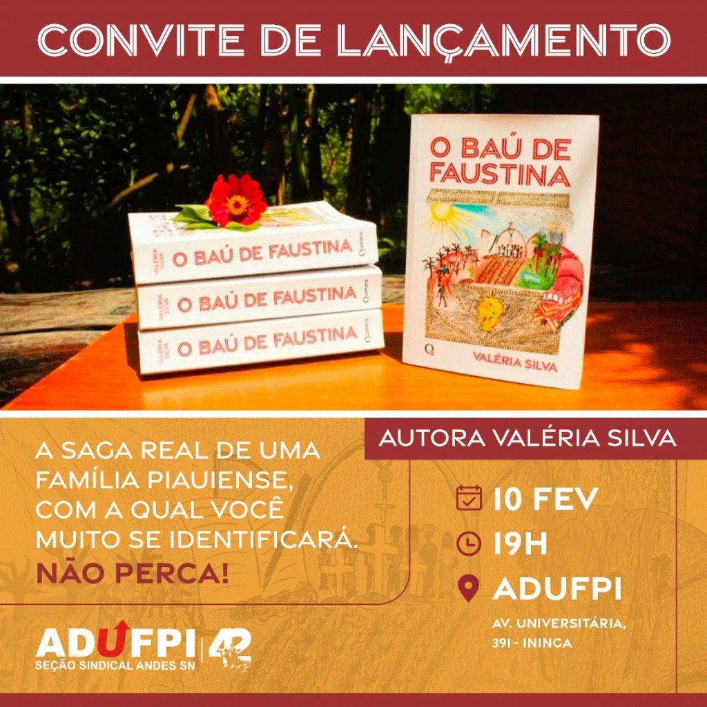 Amanhã (10/02), às 19h acontecerá o lançamento da obra “O Baú de Faustina”, da escritora Valéria Silva. O evento será sediado na ADUFPI que fica localizado na Av. Universitária, 391 – Ininga e será aberto para toda a comunidade, respeitando as normas de segurança de prevenção contra a COVID-19.