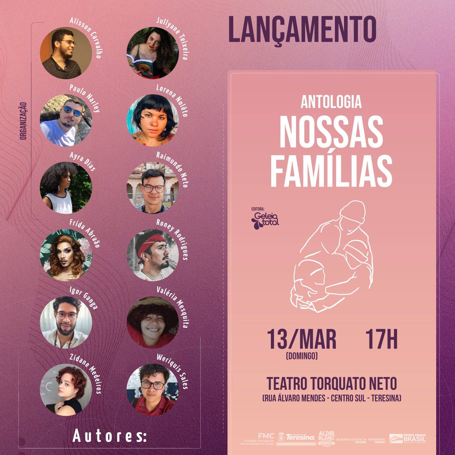 Nossas Famílias é uma antologia escrita por autores LGBTQIA+ piauienses e fala sobre afeto, além de questionar a ideia de família no singular. Trata de famílias plurais, de todas as cores, com nuances que não cabem em manuais, em ortodoxias. Com isso, os contos flutuam na premissa de que o amor supera qualquer regramento e os laços familiares ultrapassam a barreira do preconceito. Organizada por Alisson Carvalho, Ayra Dias e Paulo Narley, o lançamento está marcado para o dia 13 de março, às 17h, no Teatro Torquato Neto, em Teresina.