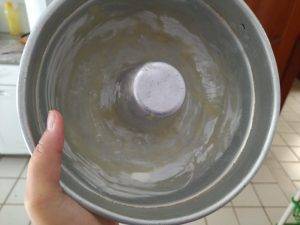 Depois, coloque farinha de trigo, para terminar de untar a fôrma. Esse processo é importante para que o bolo não grude na fôrma. Agora, coloque no forno a 200º por 40 minutos. Passou esse tempo, você pode espetar o bolo com uma faca. Se ela sair limpa, é porque está pronto. Se não, pode deixar mais 10 minutos para terminar de assar.