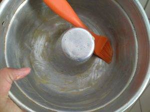 Com um pincel culinário ou com um guardanapo, você vai untar uma fôrma com margarina.